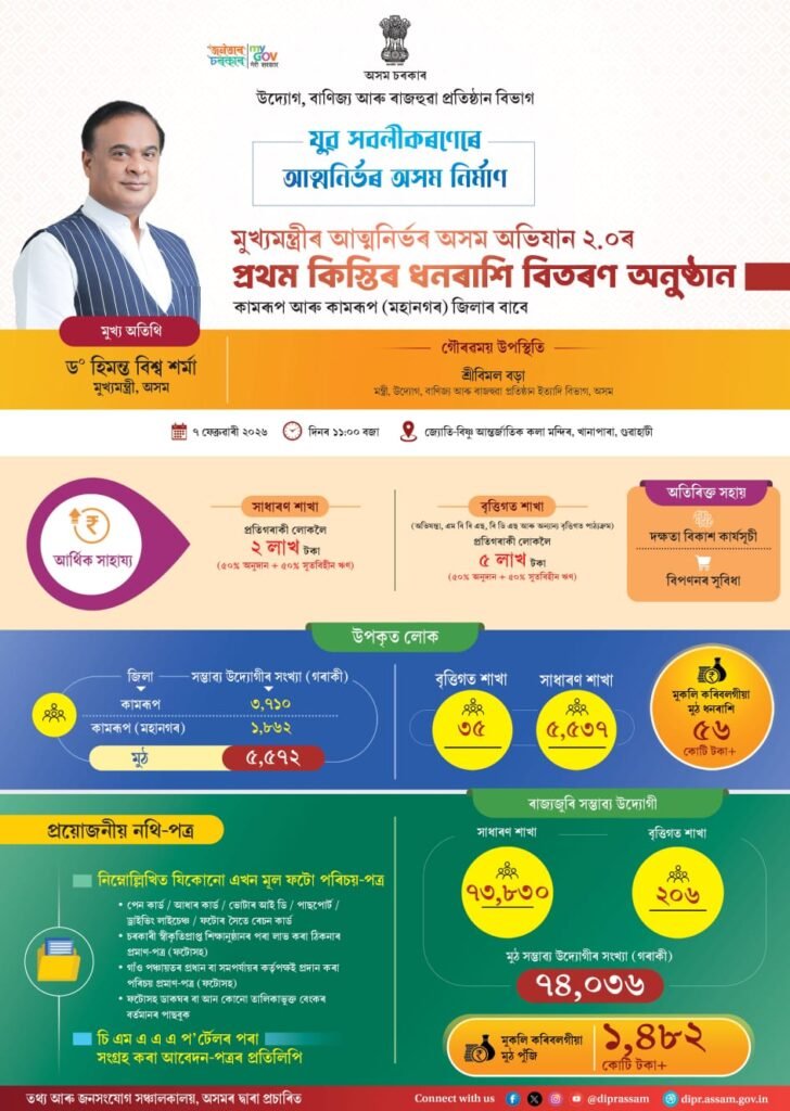 On 16 January 2026, the Hon’ble Chief Minister of Assam made a major announcement regarding the Mukhyamantri Atmanirbhar Asom Abhiyan (CMAAA). According to the announcement, the financial assistance under CMAAA will be distributed from 6 February 2026.